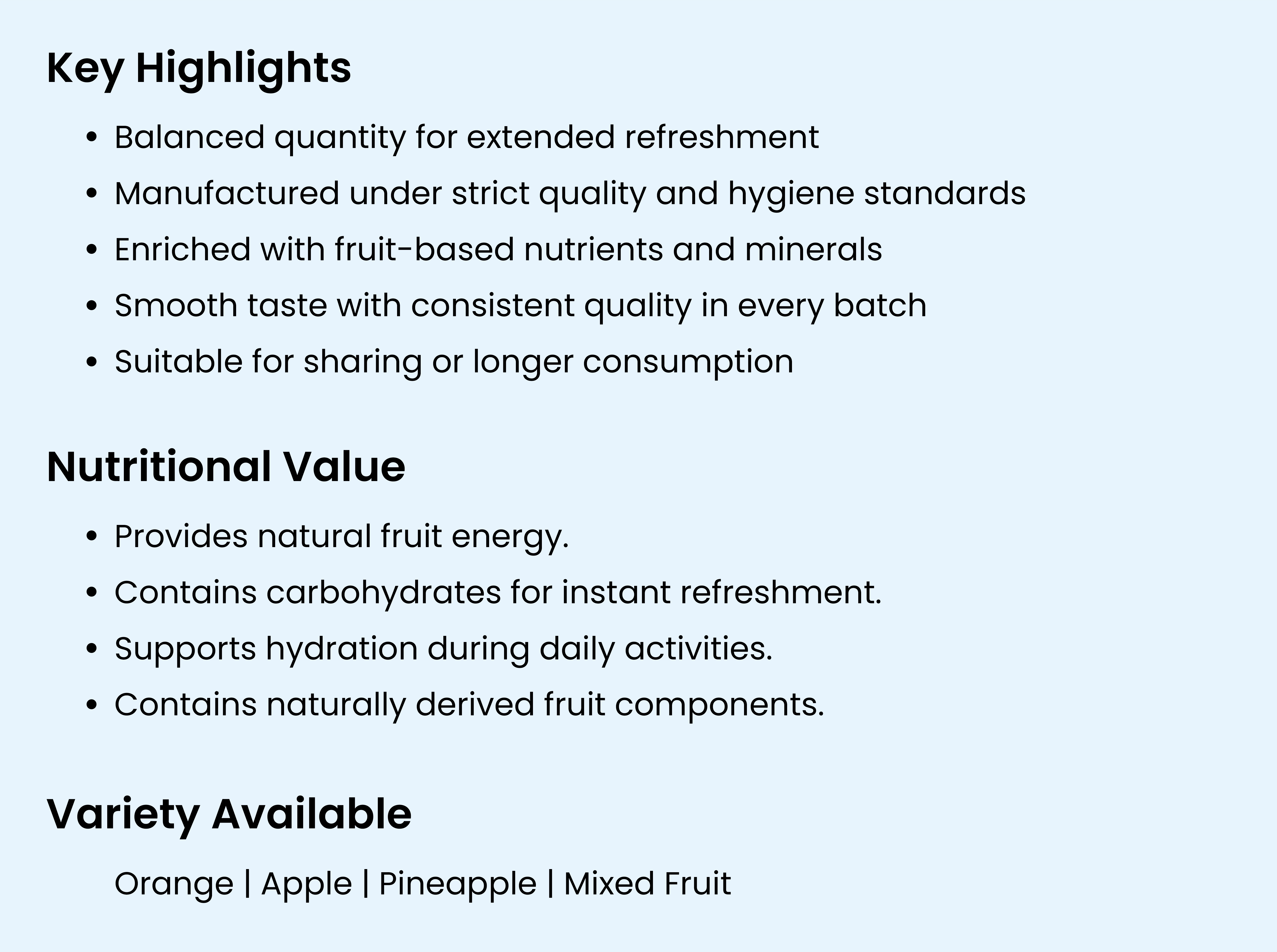 Variety Available: Orange | Apple | Pineapple | Mixed Fruit