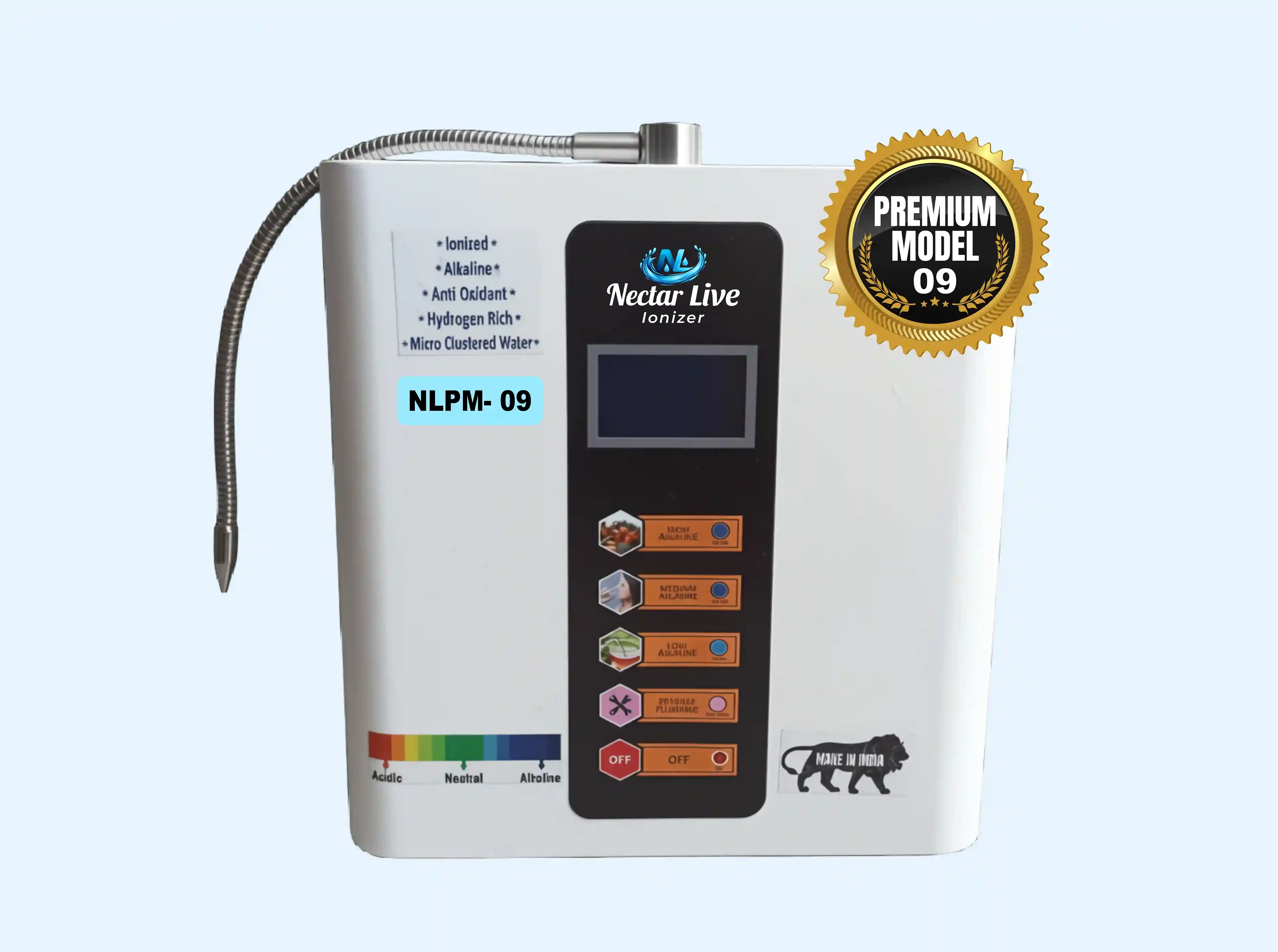 The NLPM-09 is a machine designed for outstanding performance. It features an advanced built-in electrolysis chamber that helps produce stable oxygen, improved micro-clustering, and higher negative ORP levels, making it a powerful and reliable flagship model.
